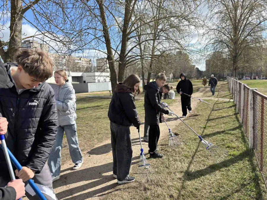 Сегодня территория гимназии проснулась под шорох метел, звон смеха и размеренный стук грабель. Педагоги, сотрудники и ученики — все, не сговариваясь, стали одной большой командой, выйдя на республиканский субботник.