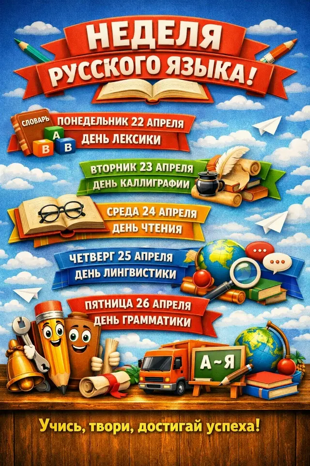 Дорогие друзья! Сегодня, 13 апреля, мы открываем нашу праздничную неделю, посвящённую великому и могучему русскому языку. Это не просто школьный предмет, это наш верный друг, который помогает нам мыслить, творить и понимать друг друга.